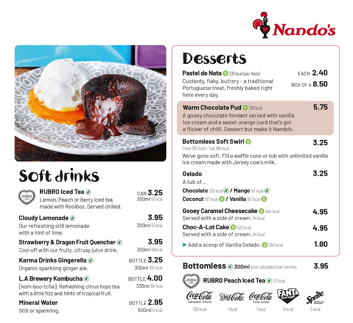 In addition to the chicken, the menu features a variety of options including burgers, wraps, and salads, all of which can be made with chicken or a vegetarian substitute. For those craving comfort food, the famous Nando's sides like spicy rice, peri-peri chips, and garlic bread are the perfect complement to your main course. The selection of drinks, including soft drinks and a few alcoholic options, adds a nice touch to the overall experience.